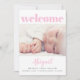 Ett enkelt och sött uttalande från baby om att välkomna flicka till världen. På framsidan skrivs "välkommen" i den moderna rosa typografin över ett foto av baby. Under underjorden kan du lägga till hennes namn, ankomstdatum, vikt och längd i en mjuk grått-typografi av mörk. På motsatt sida kan du lägga till ytterligare tre foton av baby och hennes familj, liksom namn från hennes lyckliga föräldrar och syskon. Fototips: För bästa resultat bör fotona på framsidan och grund på baksidan vara rektangulära och de två främsta fotona på baksidan ska vara fyrkantiga eller ha subjekt i mitten.