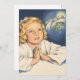 Gammaldags religiös illustration med en ung blond flicka som ber vid sänggåendet och drömmer om Jesus Kristus.