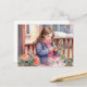 Detaljerad bild av en söt flicka som skapar utomhus på en snöig dag. Mjuka pastell färger. Text på baksidan önskar mottagarna en "Grattis på födelsedagen!"