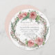 Baby Sprinkle-formulering i Runda format för en mycket unik babydusch. BOHO stilade duschtemat i flicka med en söt, muterad palett av rosa, kakaobunt, grått och grönt från färg. Med ro blomma krona med baby andedräkt, eukalyptus löv och fitta. Arkitekturen Audrey Jeanne Roberts, alla höger reserverade.