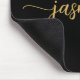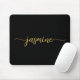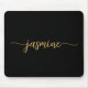 Flickaktig Svart Och Guld Enkel Minimalistisk Monogram Namn Signatur Skript Anpassad Personlig musmatta. Dessa mönster har ditt förnamn i en snygg handstilsfont typografi med svans på svart och guld. Dessa är lätta att anpassa. Jättefin stilfullt feminint present för födelsedag, bröllopsdusch, mors dag, 16-årsdag och Det är för tjejen som älskar unika minimalistiska stiliga saker.