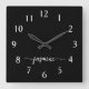 Flickigt enkel minimalistisk svart monogramnamn skript Anpassad personlig fyrkantig väggklocka. Dessa mönster har ditt förnamn i en vacker handskriven svansfont-signatur typografi vit skrift på svart bakgrund. Dessa är lätta att anpassa. Fin stilren och feminin husvärmegåva, även för födelsedag, bröllop, brudshow, mors dag, söt 16-års födelsedagsfest och baby shower, examen och det är för flickan som älskar unika glänsande stiliga saker.