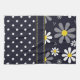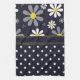 En handduk med ett flickaktigt retro modblommamönster på det bästa med vitdaisy med gult centrerar mot en marinblå bakgrund, och en moderiktig blått- och vitpolka pricker mönster på grunden.