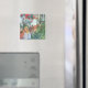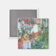 Den lilla blonda flickan i blå klänning som går längs den sida av huset där rött och blåa blommor växer. Vintage bra art vattenfärgsbild av Carl Larsson.