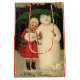 Julpresentsäck - vintage grafik av en liten flicka i armen jackar att skydda ett leende Snögubbe med ett grönt paraply.