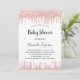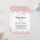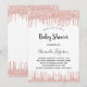 För en babydusch, fira en flicka. En vit chic bakgrund. Dekorerad med ro guld, faux glitter droppar, färgdroppstift. Anpassa och lägga till uppgifter om mamma till namn och party. Namn och texten: Baby Shower är skrivet med ett handskript i stil