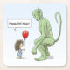 Flickan säger grattis på födelsedagen till sin vän den stora grönten.