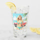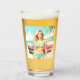 Porträtt om en charmerande flicka på en vacker tropisk strand med sol och till havs, och en klassisk flammande röd bil, som ramar den ljusa panorama med vibrerande, ljusstark sommartid färg.