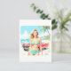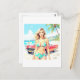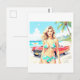 Flickan på stranden med en klassisk bil vykort