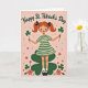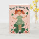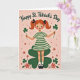 Det här kortet visar en storögt ung flicka med eldröda flätor bundna med svarta band, som står längst fram med rosiga kinder och ljusgröna ögon som verkar möta dina med en lätt, vänlig leende 💚. Hon bär en grön och krämrandig klänning med vita strumpor och svarta Mary Jane-skor, vilket ger henne ett prydligt, sagoboksaktigt utseende. Hennes armar sträcker sig utåt, och i varje hand erbjuder hon en treklöver på en slank stjälk, som om hon delar en liten lyckosam symbol med någon nära ☘️. En stor, mörkgrön treklöver sitter bakom henne som en bakgrund och ramar in hennes figur mot en varm rosa bakgrund. Längst upp står orden "Happy St. Patrick's Day" i mörkgrön text, välvd snyggt ovanför hennes huvud. Det rosa fältet är översållat med små röd-orange blommor och små virvlande slingor som driver runt henne, vilket ger rörelse utan att tränga scenen. Det övergripande intrycket är mjukt och lätt texturerat, med enk