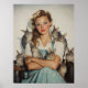 En charmerande ung kvinna i vintagens overaller sitter fredligt, omgiven av kaniner. Hennes varma leende och mjuka uttryck skapar en hjärtslitande och nostalgisk scen, som påminner om klassisk amerikansk konst.