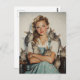 En charmerande ung kvinna i vintagens overaller sitter fredligt, omgiven av kaniner. Hennes varma leende och mjuka uttryck skapar en hjärtslitande och nostalgisk scen, som påminner om klassisk amerikansk konst.