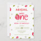 Jordgubbsberry: Bjud i första födelsedag till flicka, söt till en. Jordgubbar, löv och vita blommigtar. Berry 1:a födelsedag inbjudan.