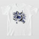 Den här coolan-flickans t-shirt-basket har en "explosion" av olika storleka basketbollar som har alternerande blåa, svarta och vita färgade paneler och blå, grått och vita stjärnformer - anpassa med idrottsmannens monogram- eller jersey-nummer - design finns på framsidan av t-shirt men kan flyttat till eller dupliceras på baksidan - av katz_d_zynes