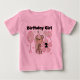 En flickapa omgiven av rosa ballonger och blommor sitter på några födelsedagspressar och skriver "Birthday Girl 2" på apa, andra födelsedag, t-shirts, kroppsdräkter, kort, tote bags, magneter med mera.