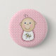 En förtjusande bebis knäppas och magneten som presenterar en flicka som ha på sig en rosa blommig haklapp mot prucken bakgrund för rosor och för vit polkaen. Skräddarsy dem på fläcken med ett namn eller annan text!