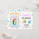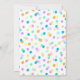 Den här inbjudan till flickans regnbågsfödelsedagsfest har en regnbågsfärgad födelsedagstårta med vit glasyr, strössel och brinnande ljus omgiven av konfetti. På baksidan finns ett mönster med regnbågsballonger. Ersätt exempeltexten med din egen. Se hela den matchande kollektionen.