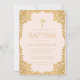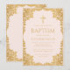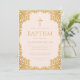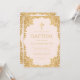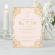 Denna eleganta rosa och guld dopinbjudan med vintage-känsla, rekommenderas för en flicka, har en utsirad falsk guld folie ram med gyllene blad på en rosafärgad bakgrund. Ovanför texten finns ett religiöst kors i falsk guld folie. All text kan anpassas och har en gyllene färg liknande den falska guldramen.