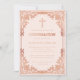 Den här elegant ro guld och den bekräftelseinbjudan till rosa med en vintage luft, som rekommenderas för en flicka, har en ornat (faux) ro guld-folie ram med elegant baroque-dekorationer på rosa. Ovanför texten finns det en religiösa kor i ro guld. Med undantag för "bekräftelsen" från tillfälle, som också finns i ro guld, kan all text vara personlig och ha ett färg som liknar ramen ro. På baksidan finns ett ovalfoto med platshållare i samma ram. Vintagen, Ornate ram, bygger på en antika Fransk bok-täckmantel, av Georges Mercier (1885-1939) - Madame de Maupin av Theophile Gautier, utgåva 1911, nu offentlig. Bilden av en flicka som ber kommer från Public Domain Bilder och har modellversionen.