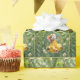 En liten, söt mus med en gult klänning och bog på en sväng omgiven av daisy