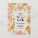 Denna "vild ett" djungel safari, den vanlige flickans första födelsedagsfest inbjudan, har fotfolie från guld (giraffe, lejon och apa), djungelvall från guld och rosa, och en sprinkling av konetti från guld på en krona. Lägg till information om födelsedagstjuren och party i namn i svart text. Ett samordnande mönster i ram om rosa och guld löv visas tvärtom.