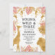 Denna "unge, vild och tre" djungelsafari, den så kallade flickans tredje födelsedagsfest inbjudan, har fotfolie från guld (giraffe, lejon och apa), djungelblad från guld och rosa, och en sprinkling av konetti från guld mot en vit bakgrund. Lägg till information om födelsedagstjuren och party i namn i svart text. Ett samordnande mönster i ram om rosa och guld löv visas tvärtom.