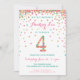 Fira din 4-årings födelsedag med färgglada guld-, rosa-, mint- och teal-konfetti på dessa 4-års inbjudningar! Med din dotters födelsedagsdetaljer och en "4" i konfetti. Rubriken lyder "HIP HIP HOORAY!" Söta färgglada ränder på baksidan.