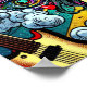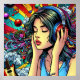 Färgfull ai-konst som skildrar en tjej med hörlurar på att lyssna på musik med en gitarr i bakgrunden. Tecknaden för popkonst stil tecknad bok.