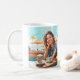 Sömmande flicka med en avslappnande kaffebrytning, cappuccino. Konstnärlig bild för avslappning och roligt, med solig havsbakgrund.