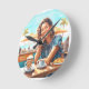 Sömmande flicka med en avslappnande kaffebrytning, cappuccino. Konstnärlig bild för avslappning och roligt, med solig havsbakgrund.