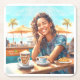 Sömmande flicka med en avslappnande kaffebrytning, cappuccino. Konstnärlig bild för avslappning och roligt, med solig havsbakgrund.