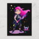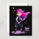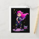 En vacker leende flicka med rosa hår har en sten gitarr i händer. Hon är glad och positiv. Hon har en snyggt och en bra apparat som betonar hennes personlighet. Det finns en lustig skalle som ett attribut för musiken som spelas av en musiker. Bilden ritas i en tecknad stil. Tillsammans med ett kopplat vykort med sin vän Blue, gör de en underbar musikalisk duo