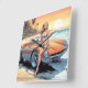 En modern porträtt av en charmig flicka, med en sportbil, i ett vackert landskap av hav och strand, med varmt färg vid solnedgången. Datorgrafik