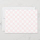 En inbjudan till en födelsedagspresent med en illustration av fyra par fötter med flamingo, björn, katt och tofflor. Pajamas har pastellprogram. Bakgrunden är rosa schackbräde mönster.