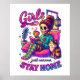 En brant, färglös design med ett kvinnligt skelett sitta i en bekväm stol med katten, som läser bok och håller kopp i kaffe. Den färgstarka texten lyder: "Flickor vill bara stanna hemma". Den här utformningen är tillgänglig för en mängd olika produkter.