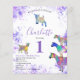Det är hennes första födelsedag att fira med denna roliga samling av färgglada akvarellstänk med get-illustrationer i livfulla rosa, lila, blå, orange, gula och akvafärg. En söt inbjudan till 1-årsfest för lantbruksdjur med barngetter och getter som står på getter. Denna roliga festinbjudan är lätt att anpassa för att skapa en unik festinbjudan som passar för barn och vuxna getälskare. Färgglada lila-tema psykedeliska get- originalillustrationer av konstnären Catherine Sweetman