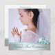 Elegant tealblå flickors foto inbjudan till första kommunion. Denna vackra tealblå foto inbjudan till första kommunion kan enkelt anpassas för ditt evenemang genom att lägga till ditt foto och evenemangsinformation, typsnitt, teckenstorlek och färg samt formulering.