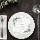 För elegantens baptism, könsneutral. En vit chic bakgrund. Dekorerad med grönt vattenfärgade eukalyptus löv, sprickor, grön, faux guld löv och guldfläckar glitter. Anpassa och lägg till namn om barnet och ett datum. Svarta och gyllene brev.