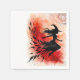 A mesmerizing silhouette of an enchantress taking flight against a crimson water color splatter, her hair and dress flowing wildly dissolving in combination with the symbols etched in the corner evoke themes of magic, transformation, and the unseen forces of nature.