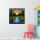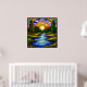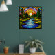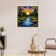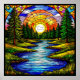 Ett färggrant glasmålingskonstverk visar en naturskön flod som flyter genom en skog under en strålande solnedgång.