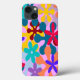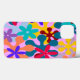 Telefonväskan har en 1970-talets återdesign av överlappande blommor i rött, blått, lila, gult, orange och rött.