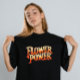 Här är ytterligare en 70-sekundersinspirerad t-shirt-design med fet, groovisk typografi som läser "Flower Power" med klara, reflekterande blommönster. 🌼 ✨ 🌸