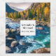 Märken från bröllop flaska med ett scenfotografi som visar träd täckta berg i höstbergen färg. En sjudande flod flyter runt lite sten.