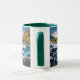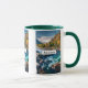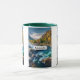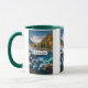 Ett mugg med ett scenfotografi med träd täckte berg i höstbergen färg. En sjudande flod flyter runt en mängd sten. En stor vit fullt-hovring över måne.