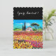 Toscansk landskap, livlig, uttrycksfull skönhet av italiensk landsbygd och färgrika blomsterfält i ljust gul orange, rosa, fuchsia, lila, röd, grön, svart färger, vackra sommarängar, blommor, cypress och olivträd, rustikt gammalt bondgård under blå himmel. Akrylmålning på duk .