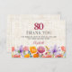 Celebrate her 80th birthday in style and thank your guests with this elegant floral thank-you card. A soft linen-look background, rose-red “80” and watercolor wildflowers in pink, purple and orange create a warm garden-party feel. Personalize the name and message to show your appreciation and make this special milestone feel even more memorable. Enjoy!