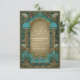 An opulent Islamic wedding design featuring a teal and gold arched frame inspired by mosque architecture and Persian artistry. With intricate floral motifs and geometric symmetry, this invitation exudes elegance, spirituality, and timeless cultural refinement — ideal for a luxurious Islamic wedding.