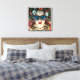 A woman lies on her back, wearing a crown of flowers and sunglasses that reflect a sunset scene.