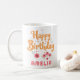 Floral Flowers Happy Birthday Handlettering Coffee Mug. Celebrate a special birthday with this charming personalized mug! Featuring a hand-drawn floral design, cheerful "Happy Birthday" text in playful orange script, and a custom name. Ideal for daughters, nieces, granddaughters, or friends.
