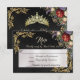 This RSVP card features a lovely floral spray on black embellished with gold leaves corners. The front has details for the recipient to fill out and the back has the young lady's name with a tiara. Designed to coordinate with the "Floral & Gold Leaves - Black & Pearl" Quinceanera Collection. To change details, click «Personalize». To move the text or change the text size, font, or color click «Click to customize further»